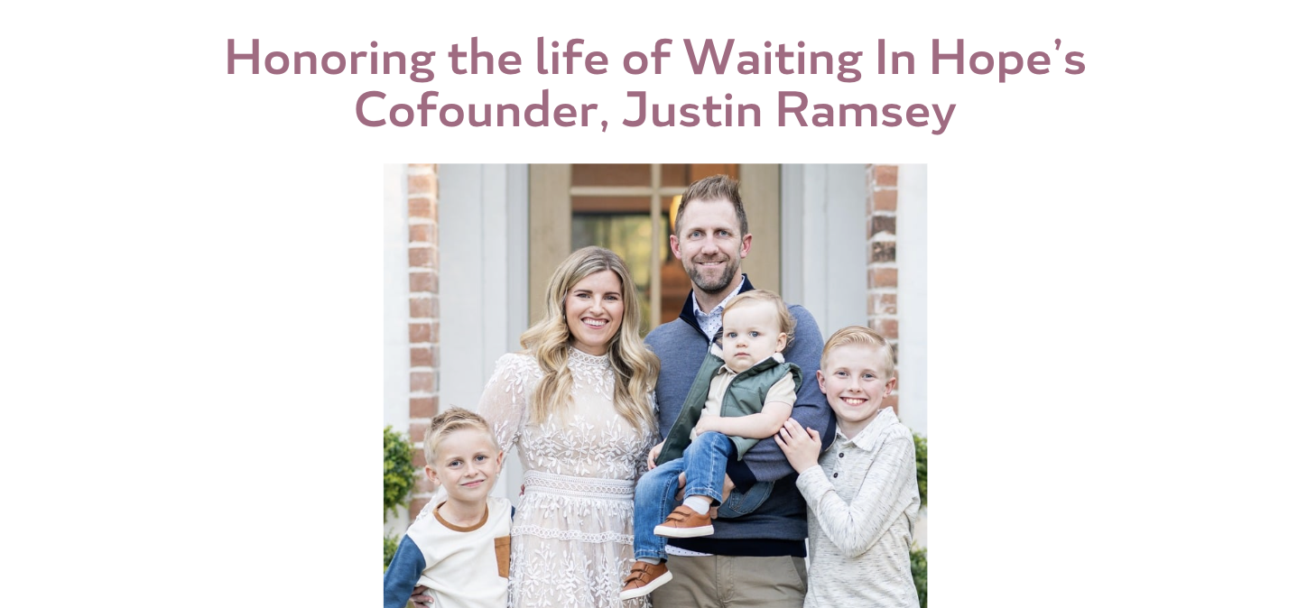 In October of 2025, our Waiting in Hope family experienced the heartbreaking loss of Justin Ramsey, cofounder of WiH and beloved husband of Kelley. Justin lived anchored in the hope of Jesus, and that same hope continues to guide this ministry today. His vision to walk with women and couples through infertility remains at the heart of everything we do.