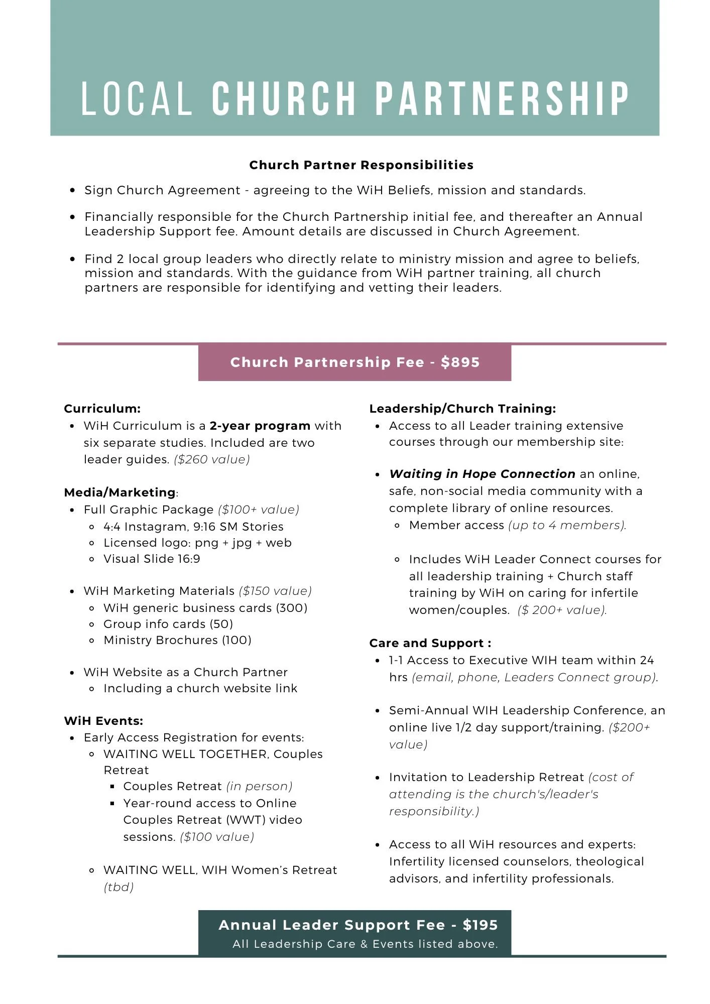 Must be financially responsible for the Initial Church Partnership Fee and optional annual renewal thereafter. Amount details are discussed in this agreement as well as opportunities to support and empower your local group in a greater capacity.